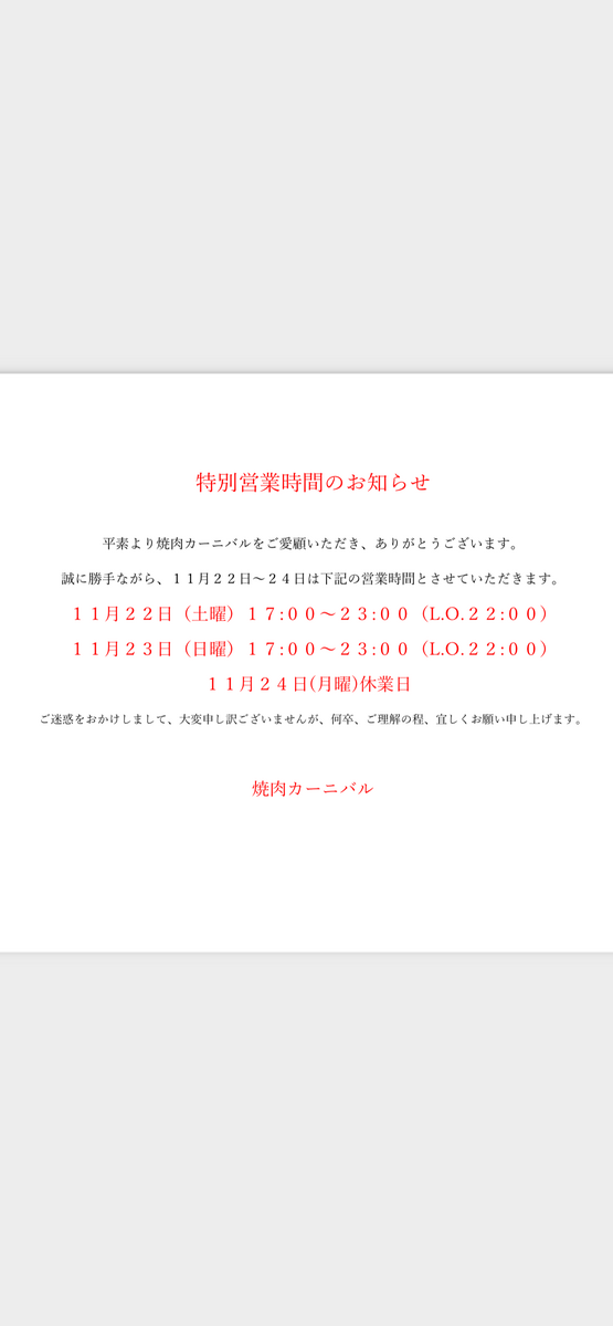 平素より焼肉カーニバルをご愛顧いただき、ありがとうございます。